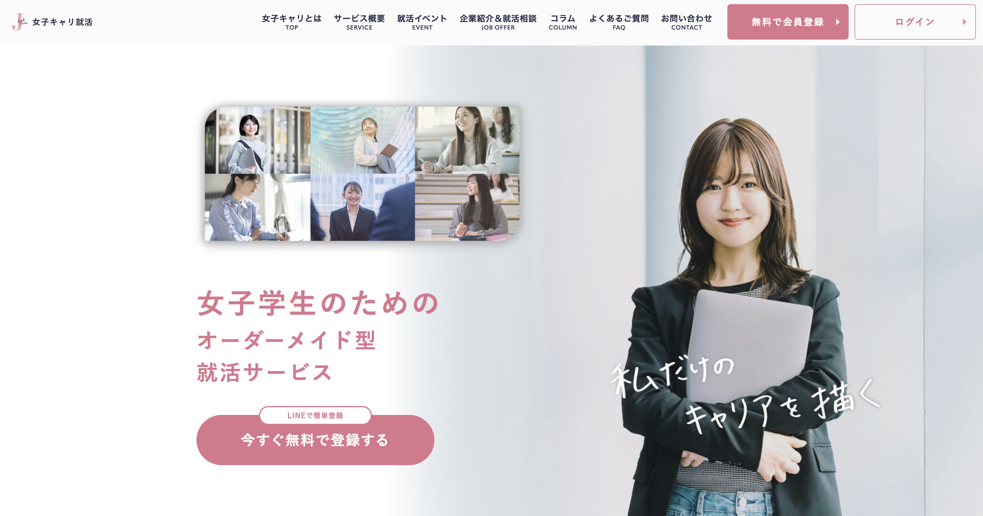 女子キャリ就活は「私だけのキャリアを描く」というコンセプトのもと、文系・理系を問わず日本全国(一部海外大学含む)の就活中・就活準備中の女子大学生に向けた就活支援サービスを展開しています。