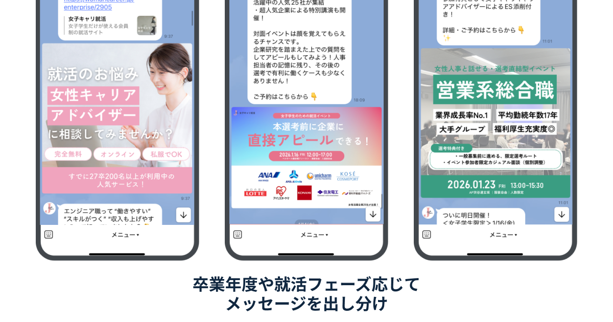 女子キャリ就活では、LINE公式アカウントを、学生との接点を創出し、次のコミュニケーションへとつなぐための役割として活用しています。