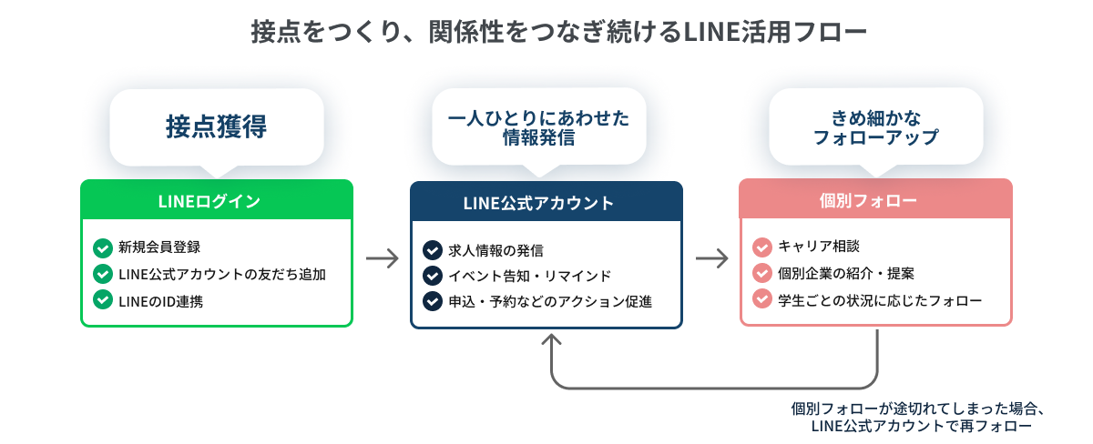 このように、LINE公式アカウントで接点をつくり、必要な情報を届け続けながら個別フォローへとつなぎ、必要に応じて再びLINE公式アカウントを起点に関係性をつなぎ直すことで、学生との関係が一過性に終わらない運用を実現しています。
