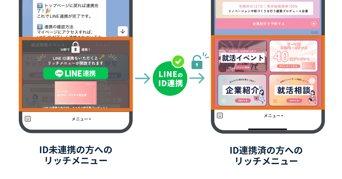 友だち追加のみでID連携が完了していない学生にはID連携を促す「鍵付き」のリッチメニューを表示し、ID連携が完了すると学生にとって便利なコンテンツが利用できるメニューへと切り替わる仕組みです。