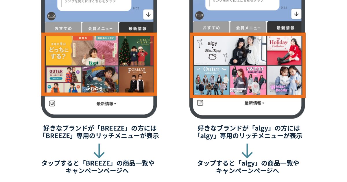 例えば、アンケートで「BREEZE」を選んだお客様には、BREEZEのリッチメニューが即時表示され、タップひとつでブランド情報にアクセスできます。