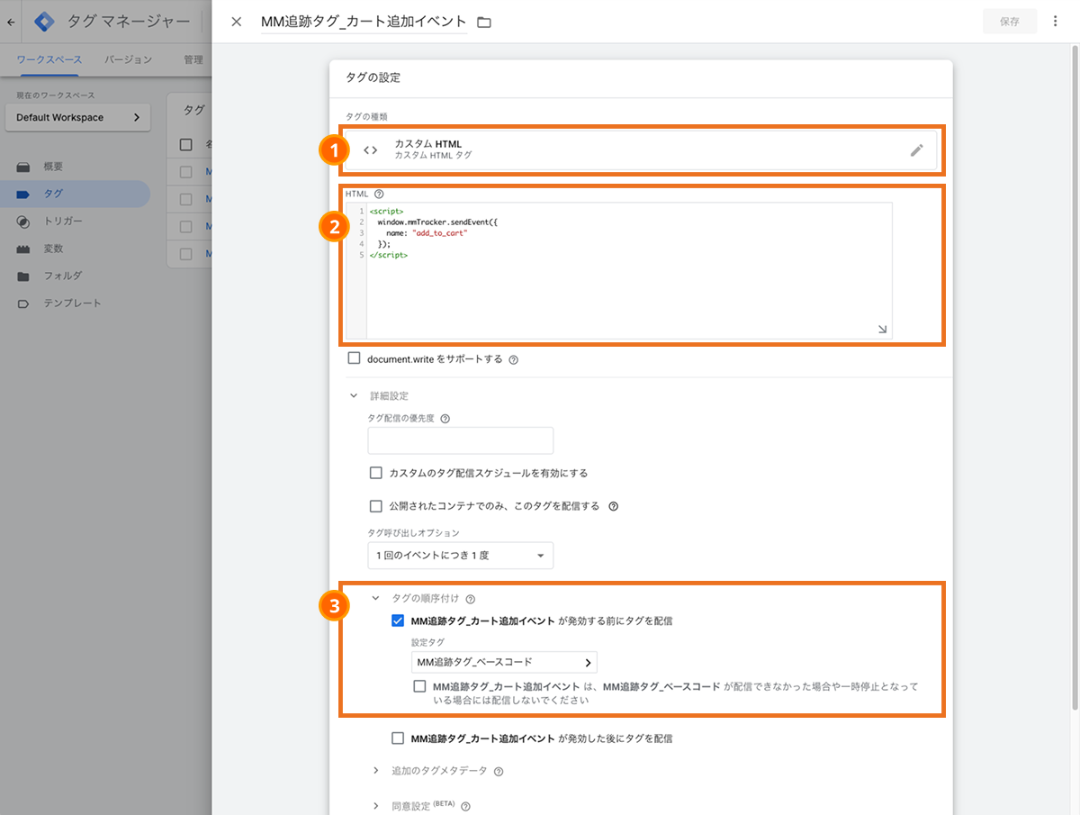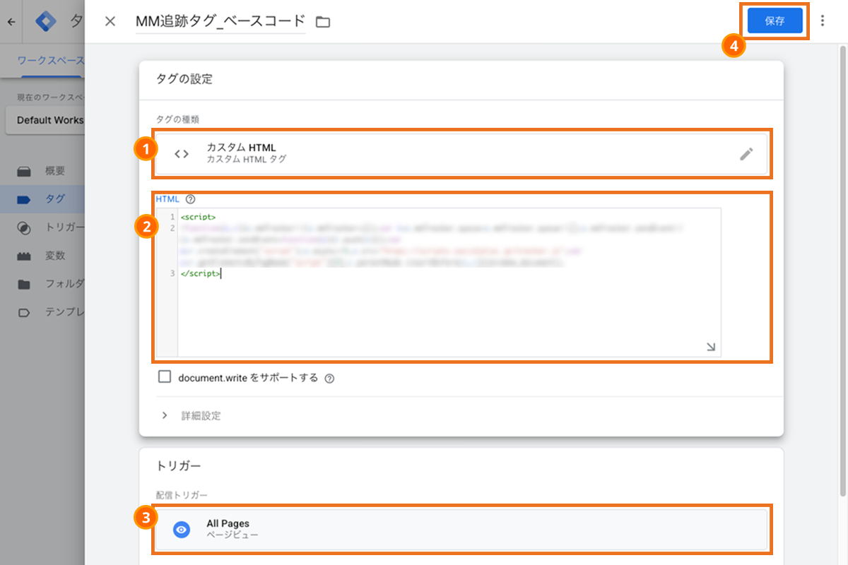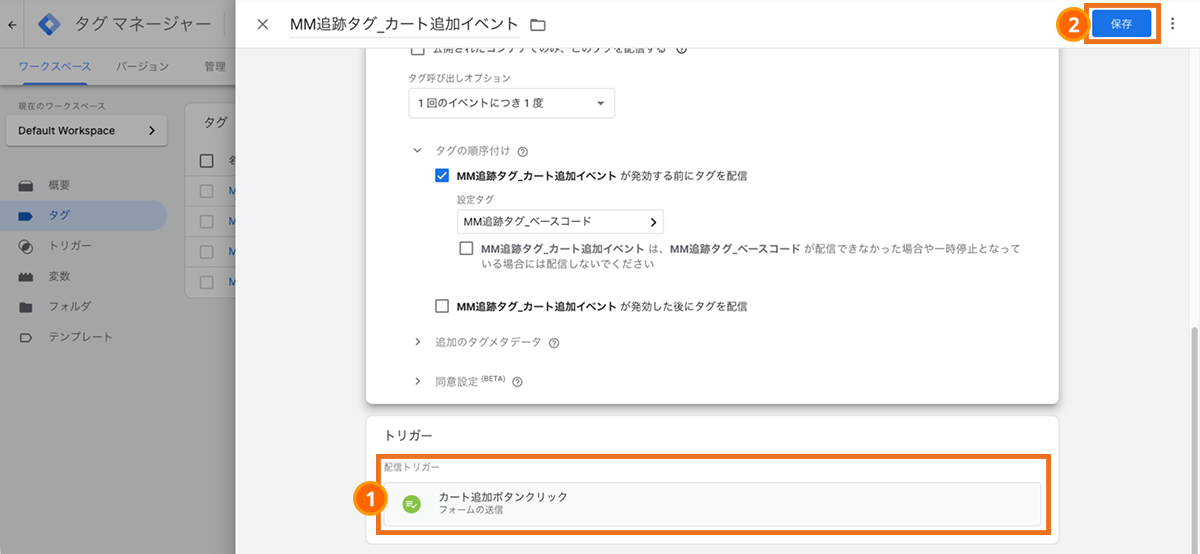 Google Tag Managerの管理画面内の「タグ」から新規タグを作成します。
